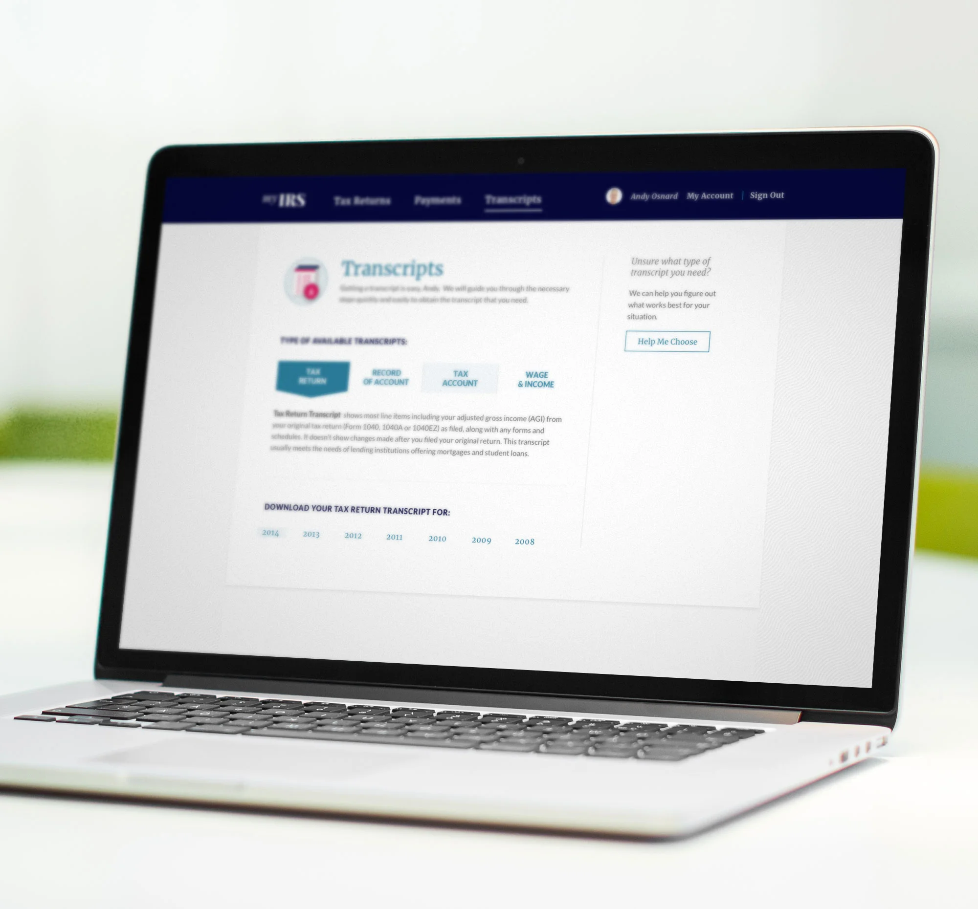 One of the most common tasks for citizens managing their taxes online is getting their tax transcript. In the existing IRS.gov web it's not easy to find the exact transcript you need for the year that you need it. By using a tab structure to explain the different types of transcripts as well as show the available dates, we made it easier for taxpayers to find what they need when they need it.
